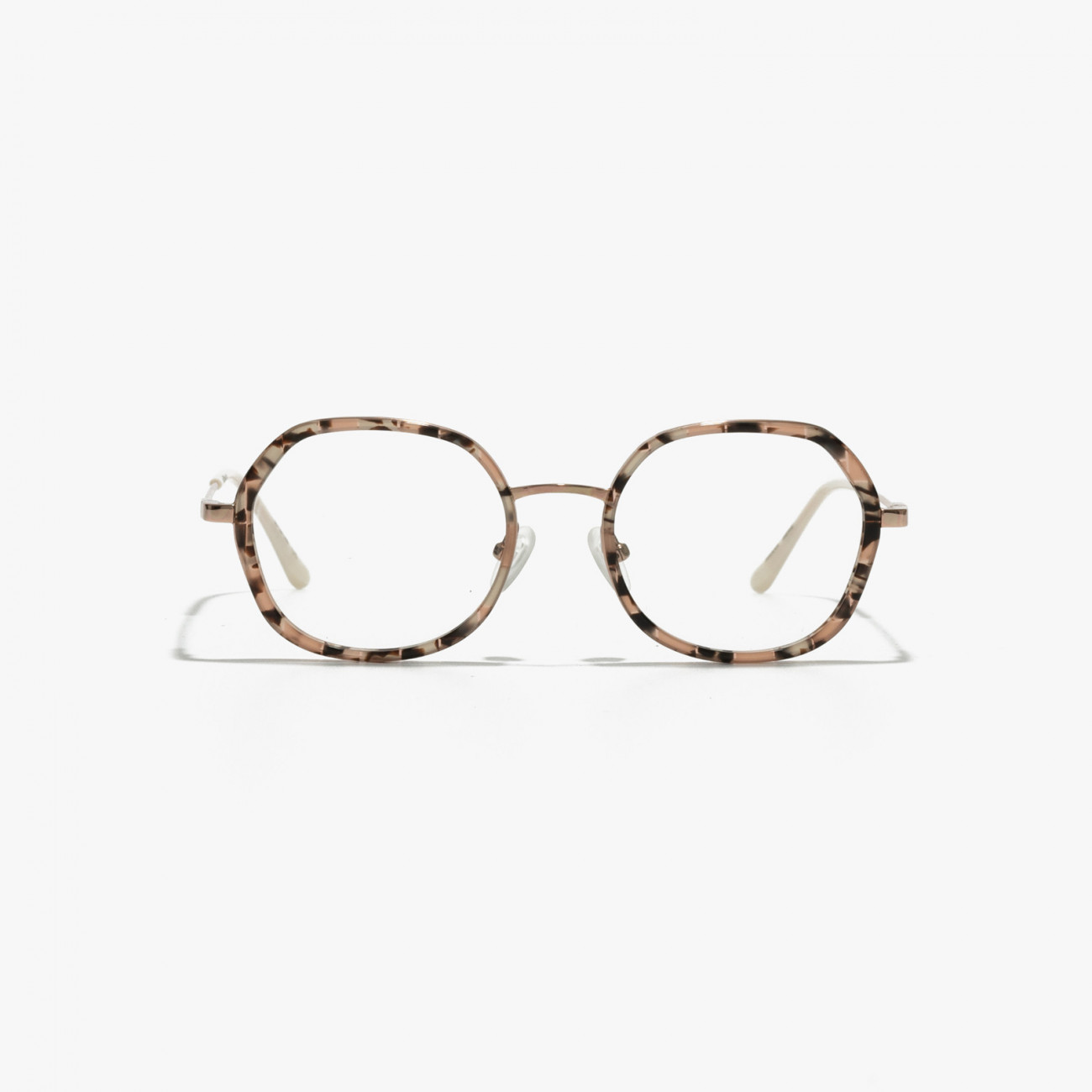Gafas para mujer de forma geométrica y oversize que propone un diseño rompedor y de tendencia. Estructura ligera de acetato en el frontal con matices nude que subrayan la mirada, combinado con finas varillas de acero inoxidable dorado rose. La singularidad de esta gafa viene marcada por su diseño femenino y elegante.